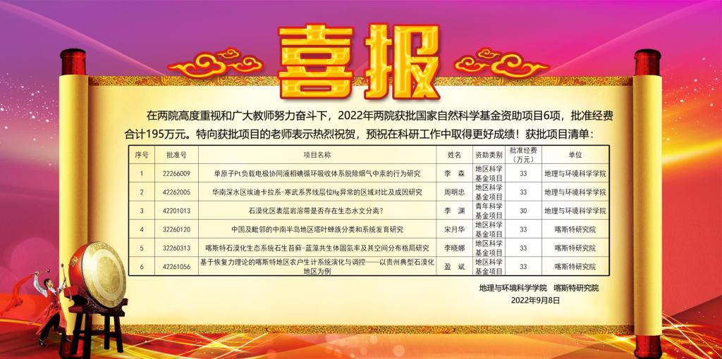 9月8日,国家自然科学基金委员会公布了2022年国家自然科学基金评审结果,bwin官网、喀斯特研究院获6项立项资助(地区5项,青年1项),资助经费达195万元。